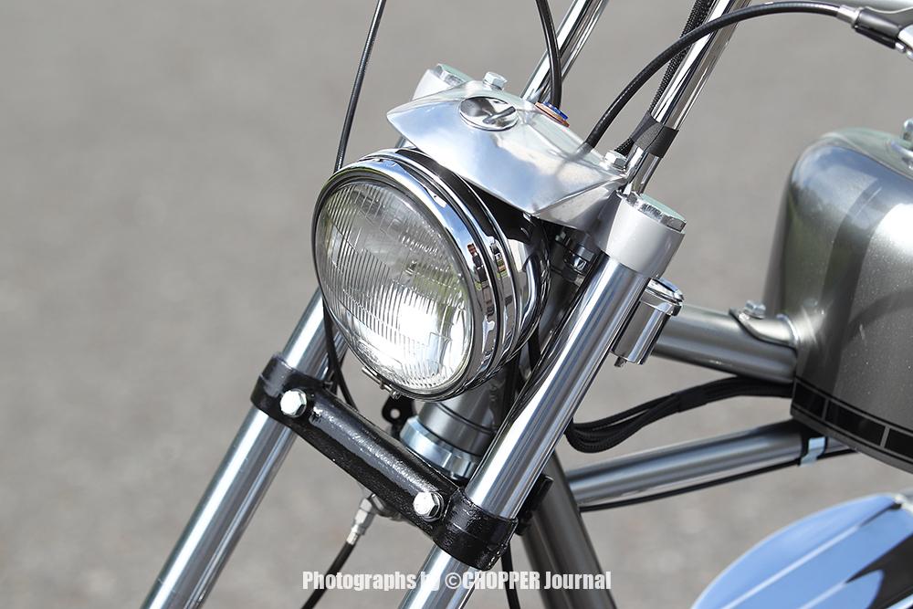S&Sのパンヘッドエンジンは93cui。トランスミッションはBakerの4Speedを使用。 フレームは純正をベースにストレッチしています。 まさにHigh speed Chopperでございます。